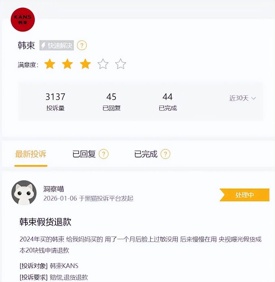在检测争议尚未厘清的同时,消费者端的不安情绪亦在集中释放。记者梳理黑猫投诉、电商平台及社交平台信息发现,围绕“韩束”的相关投诉已超过3000条,主要围绕产品成分安全、宣传功效与实际不符以及售后等问题,大量消费者要求退货退款。